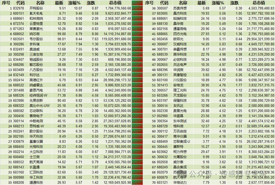 具體到中國傳感器產(chǎn)業(yè)鏈,70只傳感器核心產(chǎn)業(yè)鏈企業(yè)中,全部上漲,無一家傳感器上市股票下跌——歷史罕見。70只傳感器股票平均漲幅5.77%,總市值達到9453.23億元,而漲幅TOP 10傳感器股票的平均漲幅達到8.65%。