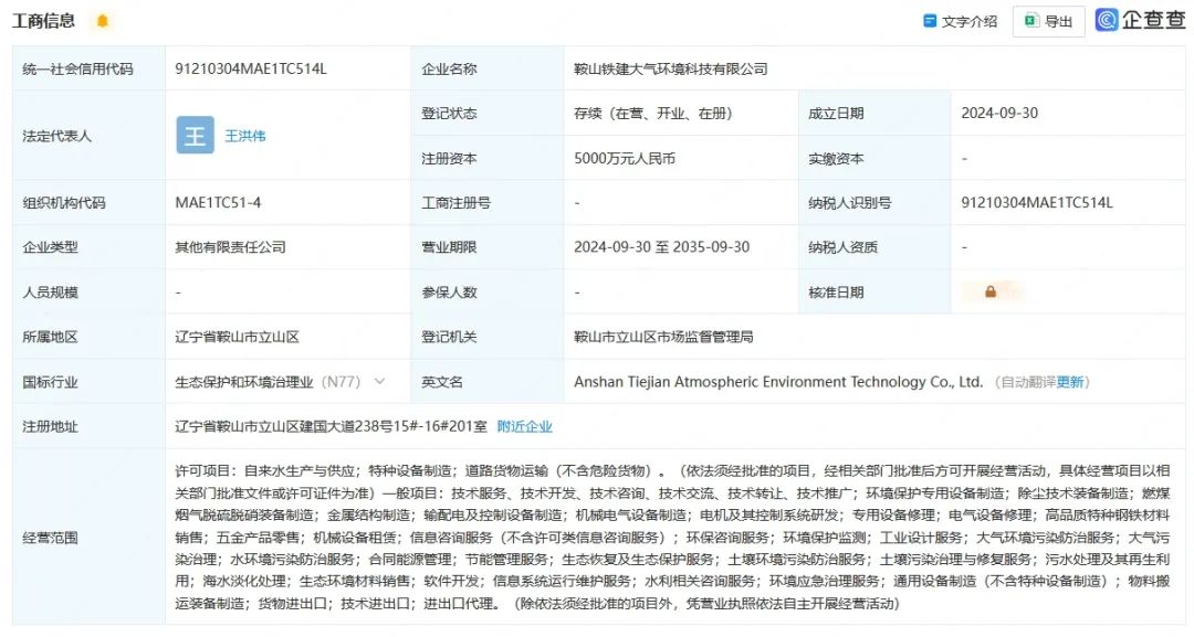近日,鞍山鐵建大氣環(huán)境科技有限公司成立,法定代表人為王洪偉,注冊資本5000萬元,經(jīng)營范圍包含:大氣環(huán)境污染防治服務(wù);大氣污染治理;水環(huán)境污染防治服務(wù);合同能源管理等。
