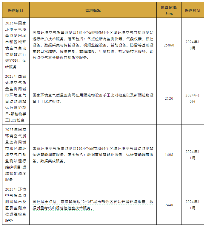 近日,中國(guó)環(huán)境監(jiān)測(cè)總站發(fā)布4項(xiàng)儀器設(shè)備采購(gòu)意向,預(yù)算總額達(dá)3.18億元,涉及2025年國(guó)家環(huán)境空氣質(zhì)量監(jiān)測(cè)網(wǎng)城市和區(qū)域環(huán)境空氣自動(dòng)監(jiān)測(cè)站運(yùn)行維護(hù)項(xiàng)目、2025年國(guó)家環(huán)境空氣質(zhì)量監(jiān)測(cè)網(wǎng)城市環(huán)境空氣自動(dòng)監(jiān)測(cè)站運(yùn)行維護(hù)項(xiàng)目-顆粒物手工比對(duì)檢查、2025年國(guó)家環(huán)境空氣質(zhì)量監(jiān)測(cè)網(wǎng)城市和區(qū)域環(huán)境空氣自動(dòng)監(jiān)測(cè)站運(yùn)行維護(hù)項(xiàng)目-運(yùn)維智能調(diào)度服務(wù)、2025年環(huán)境空氣質(zhì)量監(jiān)測(cè)網(wǎng)城市及區(qū)縣監(jiān)測(cè)點(diǎn)位運(yùn)維檢查服務(wù)等,預(yù)計(jì)采購(gòu)時(shí)間為2024年10~11月。
