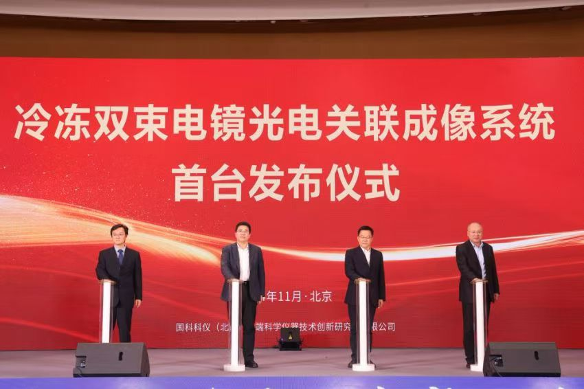 近日,中國科學院科技成果轉化“融合點”行動首場活動在京舉辦。會上,國科科儀控股企業國科科儀(北京)高端科學儀器技術創新研究院有限公司(簡稱國科儀器)與中國科學院生物物理研究所正式發布了國內首臺冷凍雙束電鏡光電關聯成像系統,北京市科委、中關村管委會黨組成員、副主任龔維冪,懷柔科學城黨工委委員、管委會副主任、懷柔區副區長蘭雄景,中國科學院生物物理所副所長柳振峰和國科科儀控股有限公司董事長李昕共同為該產品揭幕。