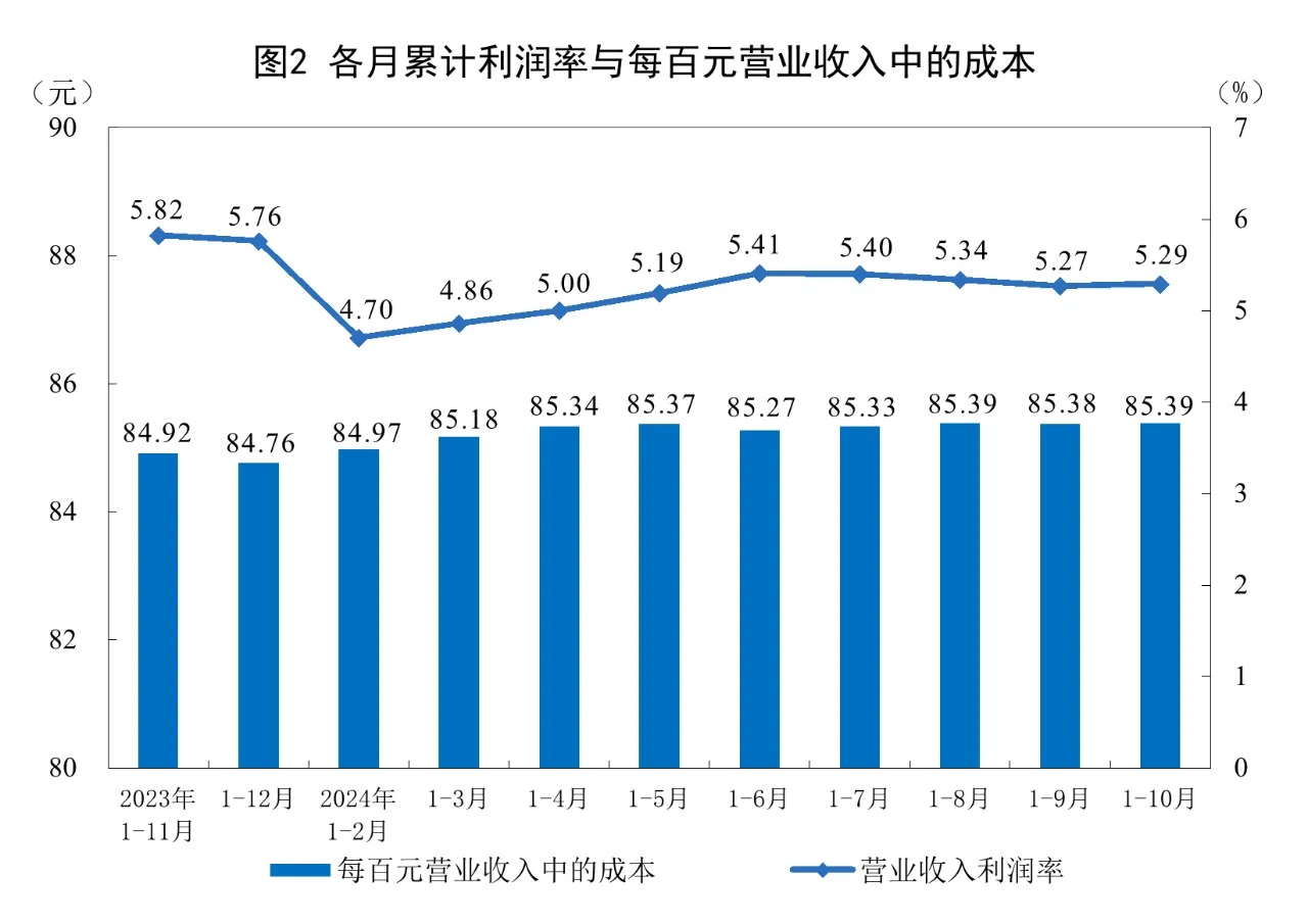 1—10月份,規(guī)模以上工業(yè)企業(yè)實(shí)現(xiàn)營(yíng)業(yè)收入110.96萬億元,同比增長(zhǎng)1.9%;發(fā)生營(yíng)業(yè)成本94.75萬億元,增長(zhǎng)2.3%;營(yíng)業(yè)收入利潤(rùn)率為5.29%,同比下降0.34個(gè)百分點(diǎn)。