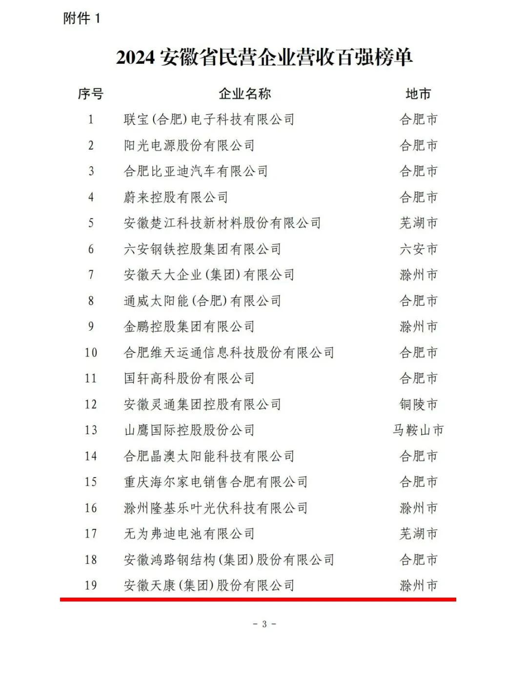 11月29日上午,2024安徽省民營企業百強發布會在合肥舉行。安徽省工商聯、安徽省工信廳、安徽省市場監管局聯合發布2024安徽省民營企業營收百強、制造業百強和服務業百強榜單。安徽天康集團憑借出色的發展成績榮列營收百強第19位,制造業百強第15位。