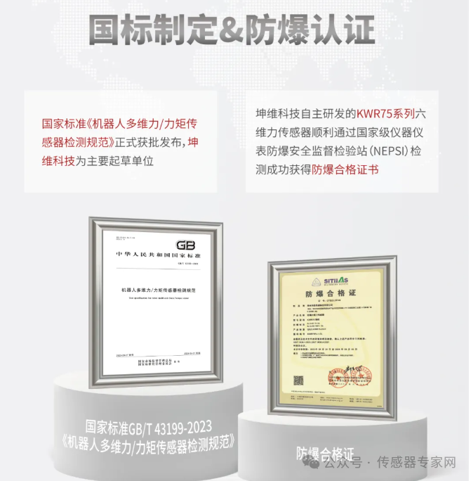 為擴張未來機器人在更多場景的應用,坤維科技率先研發(fā)出獲得防爆認證標準(等同于國際IEC60079標準體系)的KWR75系列六維力傳感器,可在煤礦、金屬加工、造紙等工業(yè)粉塵較多的場景中使用——這些惡劣環(huán)境往往對人形機器人有更強烈的需求。