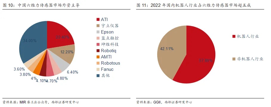 據此前MIR睿工業(yè)《2024中國六維力傳感器市場報告》顯示,2023年中國六維力傳感器出貨量不足萬臺,出貨規(guī)模剛剛突破2億元,主要應用于機器人、工業(yè)自動化和汽車等行業(yè),其市場集中度較高,TOP10廠商占接近70%份額,國產宇立儀器、藍點觸控、坤維科技位列市場份額第二、四、五位。中國六維力傳感器市場仍為外資主導。