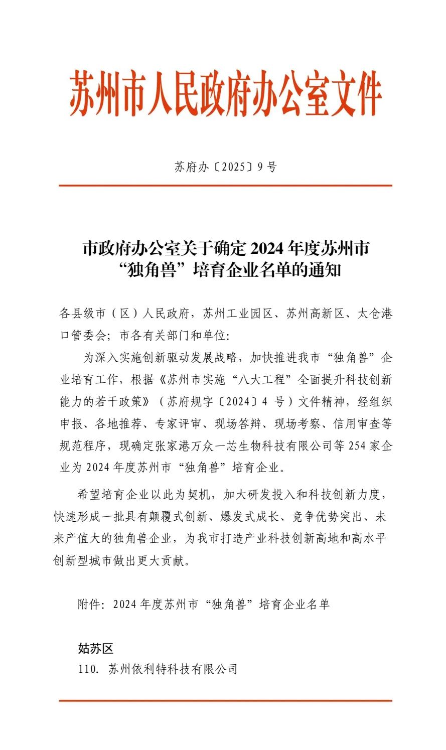 2025211日,蘇州——近日,蘇州市政府正式發(fā)布《2024年度蘇州市獨(dú)角獸培育企業(yè)名單》,蘇州依利特科技有限公司作為姑蘇區(qū)首家且唯一入選企業(yè),成功躋身這一具有戰(zhàn)略意義的創(chuàng)新梯隊(duì)。這一里程碑式突破,標(biāo)志著姑蘇區(qū)在培育高成長(zhǎng)性科技企業(yè)、構(gòu)建現(xiàn)代化產(chǎn)業(yè)體系方面取得重要進(jìn)展。