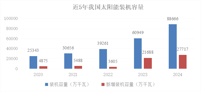 截至2024年末,全國光伏發電裝機容量達8.86億千瓦,同比增長45%,排在火電之后,位居第2位,其中集中式光伏5.11億千瓦,分布式光伏3.75億千瓦。全年光伏新增裝機2.78億千瓦,同比增長28%,其中集中式光伏1.59億千瓦,分布式光伏1.18億千瓦。全年光伏發電量達到8341億千瓦時,同比增長44%,但仍落后于核電的發電量,排在第5位。全年發電利用小時數為1211小時,發電上網利用率96.8%,較上年有所降低。