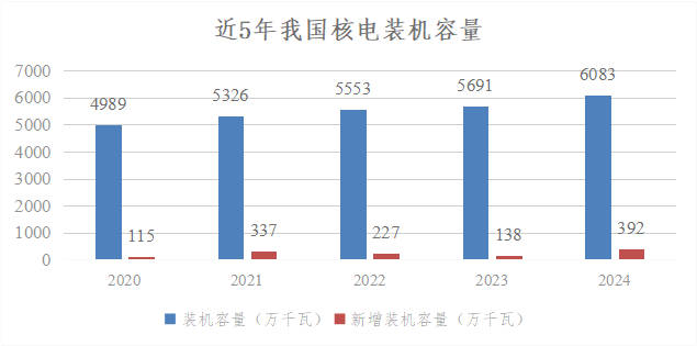 2024年是我國核電發展具有里程碑的一年,全年新核準11臺核電機組,為歷年核準數量之最,連續3年核準機組數量超過10臺;投入運行核電機組2臺,新增額定裝機規模240萬千瓦;在運、在建和核準待建核電機組共有102臺,總裝機容量1.13億千瓦,連續2年位居全球首位。截至當年末,全國運行核電機組共有57臺(不含臺灣地區),額定裝機容量為5943.17萬千瓦。全年累計核電發電量為4451.75億千瓦時,比上年同期上升了2.72%,占全國累計發電量的4.73%,超過太陽能發電量,排在第4位。由此可見,我國核電裝機占全國總裝機的比例不到2%,但發出的電量接近全國總發電量的5%。年設備利用小時數為7805.74小時,平均機組能力因子為90.26%