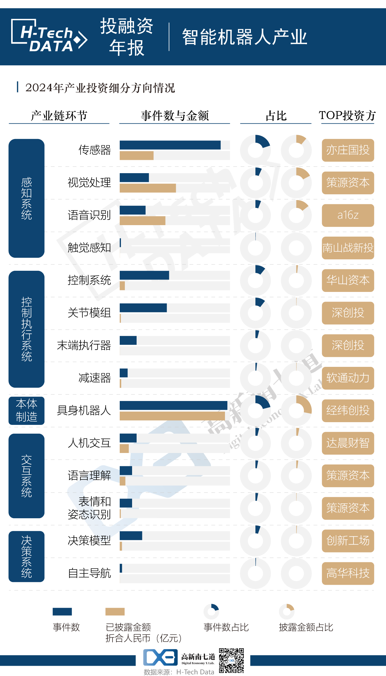 據(jù)深圳國家高技術(shù)產(chǎn)業(yè)創(chuàng)新中心披露的數(shù)據(jù)顯示,2024年智能機(jī)器人產(chǎn)業(yè)融資事件達(dá)355起,同比增長8.5%,已披露交易金額約合285億元人民幣,同比增長45.3%,其中,交易金額過10億元的事件共5起,發(fā)生于視覺處理、具身機(jī)器人、傳感器等環(huán)節(jié)。