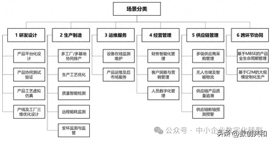 基于企業或產業鏈創造價值的過程,將場景劃分為研發設計、生產制造、運維服務、經營管理、供應鏈管理等,同時區分跨環節協同類(如圖1所示)。具體如下: