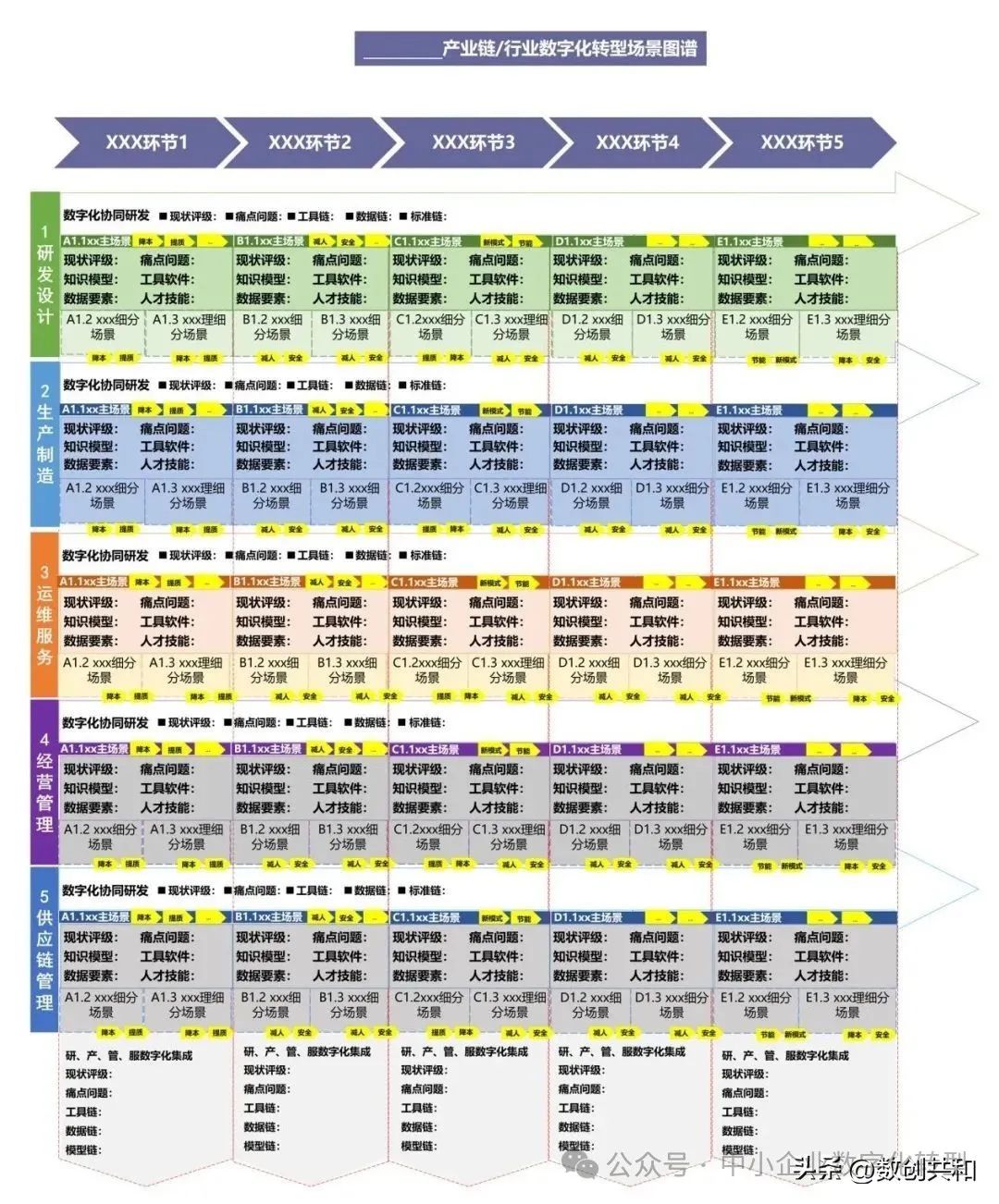 聚焦產業鏈上下游企業研發設計、生產制造、運維服務、經營管理、供應鏈管理等場景,以場景為切入點梳理數字化轉型痛點需求,繪制重點行業、重點產業鏈數字化轉型場景圖譜(簡稱一圖譜),明確企業數字化轉型路徑,促進產業鏈上下游企業協同開展轉型升級。分場景梳理數據要素、知識模型、工具軟件、人才技能等數字化轉型要素清單(簡稱四清單,合稱一圖四清單),助力政產學研各界聯合攻堅場景數字化轉型關鍵難點。