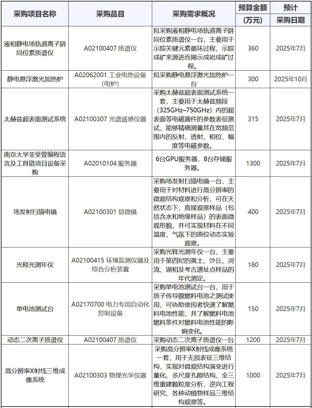 近日,南京大學公布了一批采購意向,主要涉及科研儀器和測試裝備等,包括液相靜電場軌道離子阱同位素質譜儀、場發射掃描電鏡、動態二次離子質譜儀、高分辨率X射線成像系統、激光共聚焦顯微鏡、全自動活細胞成像系統、高分辨快速掃描原子力顯微鏡、動態核極化400MHz寬腔核磁共振波譜儀等,總預算金額近1.2億元。