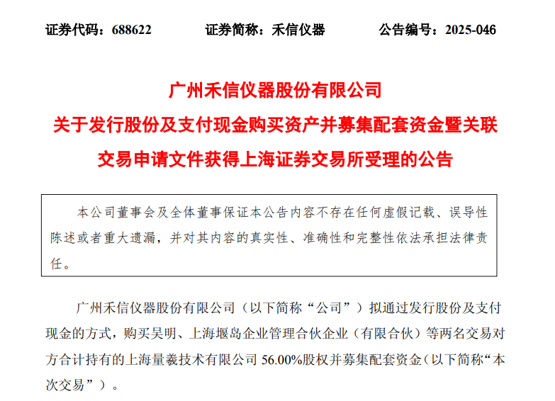 日前,廣州禾信儀器股份有限公司(證券代碼:688622)的重磅資本運作迎來關鍵進展。禾信儀器并購重組被受理,擬收購量羲技術56.00%的股權。公司公告其發行股份及支付現金購買資產并募集配套資金的申請文件,已獲上海證券交易所正式受理。