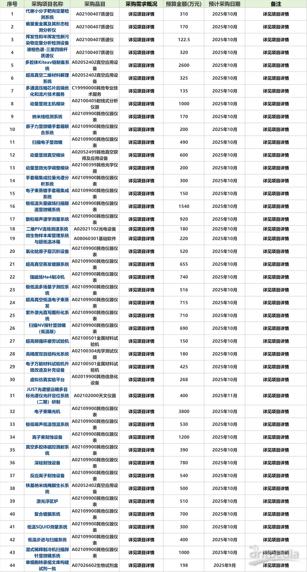 中國政府采購網(wǎng)消息,近日,上海交通大學(xué)連續(xù)發(fā)布2025年度9月、10月及11月政府采購意向。內(nèi)容顯示,該批次采購意向采購標(biāo)的涵蓋多類科研儀器設(shè)備及專業(yè)技術(shù)服務(wù),包括代謝小分子靶向定量檢測系統(tǒng)、液相色譜 -三重四級(jí)桿質(zhì)譜儀、極低溫矢量磁場掃描隧道顯微鏡系統(tǒng)等。公開信息顯示,該批次采購預(yù)算總金額達(dá)到2.67億元,采購日期方面,除“單細(xì)胞轉(zhuǎn)錄組文庫構(gòu)建試劑一批”及“JUST光譜望遠(yuǎn)鏡多目標(biāo)光譜儀光纖定位系統(tǒng)(二期)研制”將于9月和11月采購之外,其余項(xiàng)目均將于10月份進(jìn)行采購。具體信息已項(xiàng)目相關(guān)采購公告和采購文件為準(zhǔn)。