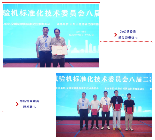 2025 9 9 日至 12 日,全國試驗機標準化技術委員會(SAC/TC122,以下簡稱 “試標委”)八屆二次會議暨標準審查會在山東省煙臺市成功舉辦。本次會議匯聚行業力量、共話標準發展,來自全國 104 家生產企業、科研院所、大專院校和檢測認證機構的 118 名領導、委員、專家代表、觀察員、顧問、標準起草組成員和相關單位代表參會,共同為試驗機領域標準化建設注入新動能。會議由試標委主辦,山東山材試驗儀器有限公司承辦,濟南鑫光試驗機制造有限公司協辦,試標委秘書長姚丙南與任霞共同主持。