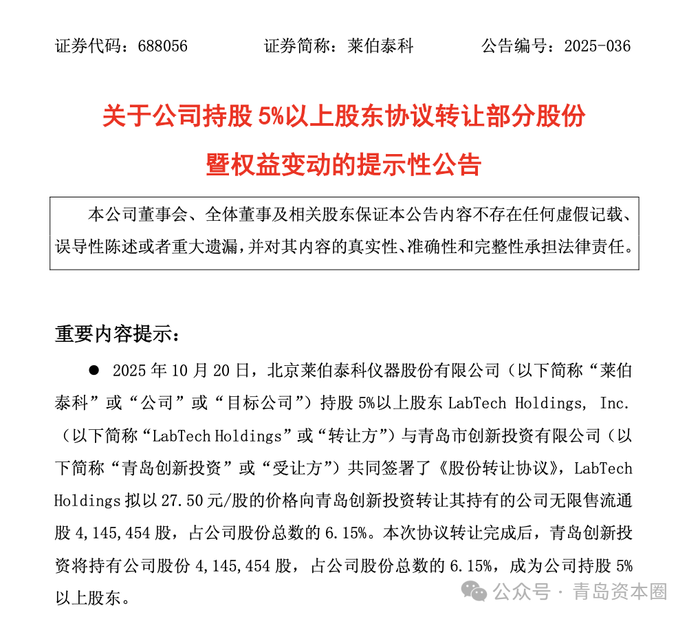 1021日,北京萊伯泰科儀器股份有限公司(股票代碼:688056,簡稱 “萊伯泰科”)發布公告稱,公司股東LabTech Holdings, Inc.(以下簡稱 “LabTech Holdings” )與青島市創新投資有限公司共同簽署了《股份轉讓協議》,LabTech Holdings擬以27.50/股的價格向青島創新投資轉讓其持有的公司無限售流通股414.55萬股,占公司股份總數的 6.15%。本次協議轉讓完成后,青島創新投資將持有公司股份414.55萬股,占公司股份總數的6.15%,成為公司持股5%以上股東。