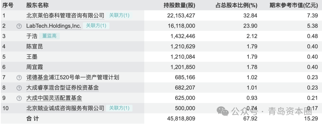 截至 2025 年半年度報告期末,萊伯泰科股東總數為3635戶。從主要股東來看,北京萊伯泰科管理咨詢有限公司為公司控股股東,持股數量 2215.34 萬股,持股比例 32.84%LabTech Holdings, Inc. 為第二大股東,持股 1611.80 萬股,持股比例 23.90%;此外,于浩、陳宣昆、王墨等自然人股東及諾德基金、大成基金等機構股東也持有一定比例股份。青島市創新投資有限公司本次戰略入股后,將成為公司第三大股東。