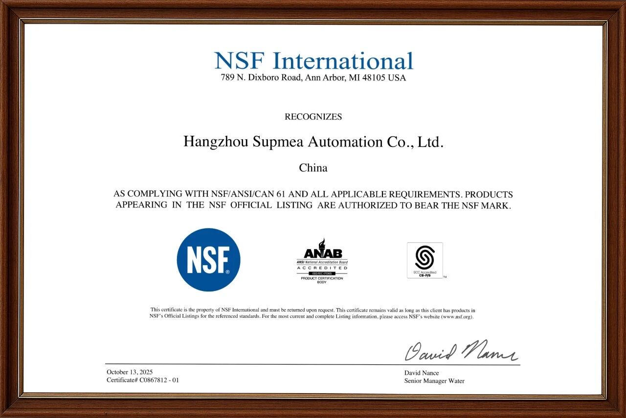 此次認證意味著,美儀電磁流量計在材料安全性、制造工藝及健康標準方面,均已達到美國與加拿大飲用水系統的嚴格要求,可廣泛應用于城市供水、民用飲水、食品飲料及其他高潔凈工況場合。
