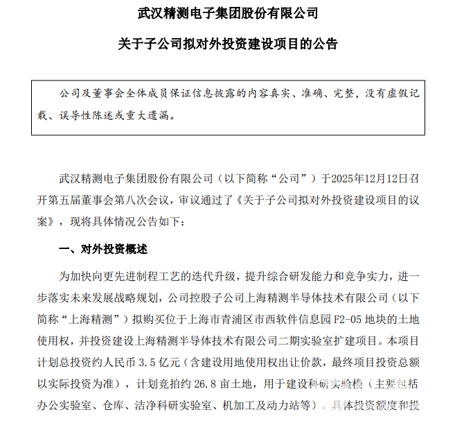 12月12日,精測電子(300567.SZ)公布,為加快向更先進制程工藝的迭代升級,提升綜合研發(fā)能力和競爭實力,進一步落實未來發(fā)展戰(zhàn)略規(guī)劃,公司控股子公司上海精測半導(dǎo)體技術(shù)有限公司(簡稱“上海精測”)擬購買位于上海市青浦區(qū)市西軟件信息園F2-05地塊的土地使用權(quán),并投資建設(shè)上海精測半導(dǎo)體技術(shù)有限公司二期實驗室擴建項目。