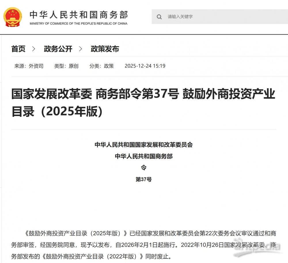 近日,經(jīng)國務(wù)院同意,國家發(fā)展改革委、商務(wù)部全文發(fā)布《鼓勵外商投資產(chǎn)業(yè)目錄(2025年版)》(以下簡稱《鼓勵目錄》),自2026年2月1日起施行。