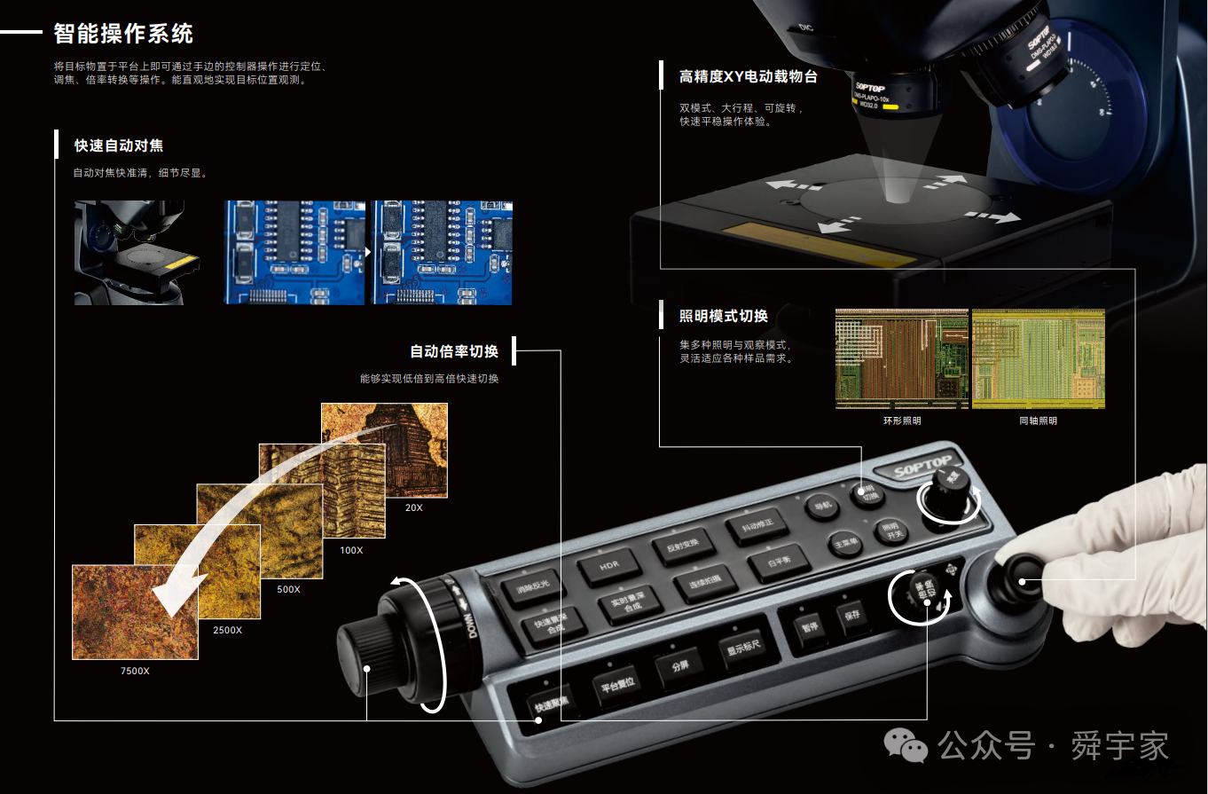 3、研發(fā)了四分區(qū)獨(dú)立控制的照明方式、實(shí)現(xiàn)對(duì)不同亮度和不同角度的燈光控制,增強(qiáng)了對(duì)比度與立體感;設(shè)計(jì)了3D超景深成像系統(tǒng)及顯微成像實(shí)時(shí)對(duì)焦系統(tǒng),提高了顯微成像系統(tǒng)對(duì)焦的精度和效率。