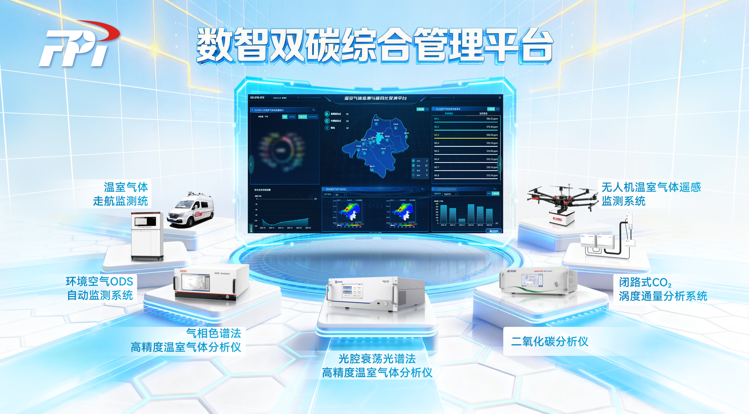 高精度溫室氣體分析儀、監測微站、無人機遙感與走航監測系統協同運行,形成“天—地一體化”感知網絡,為溫室氣體及相關大氣因子的連續監測提供支撐。