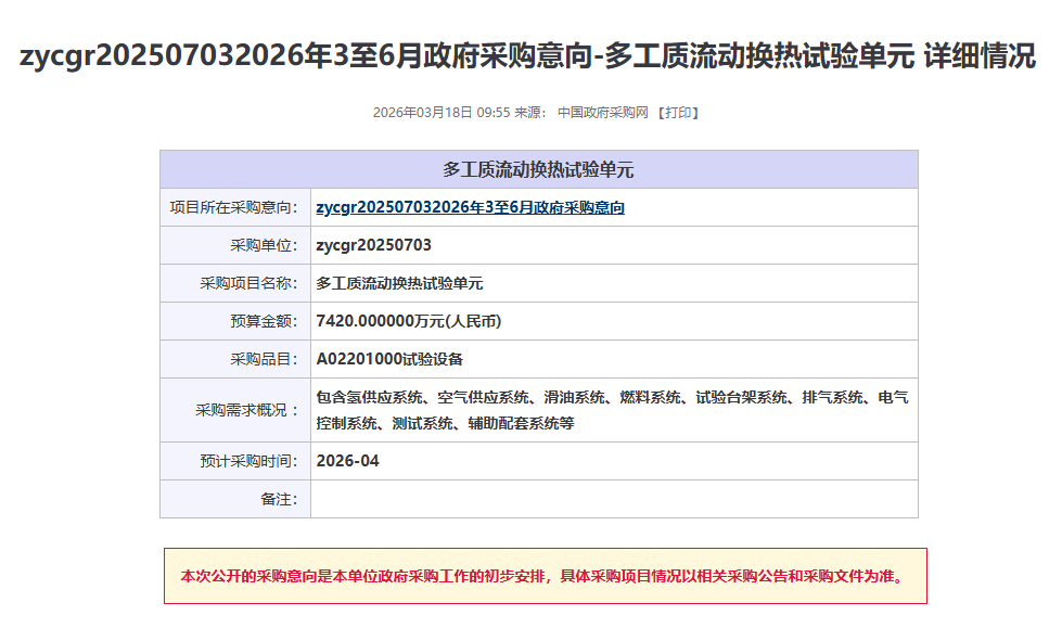 近期,zycgr20250703發(fā)布兩項儀器采購意向,采購預算金額11568萬元,涉及儀器設(shè)備包括多工質(zhì)流動換熱試驗單元、熱管理系統(tǒng)多元耦合特性試驗設(shè)備,預計采購時間2026年4月。
