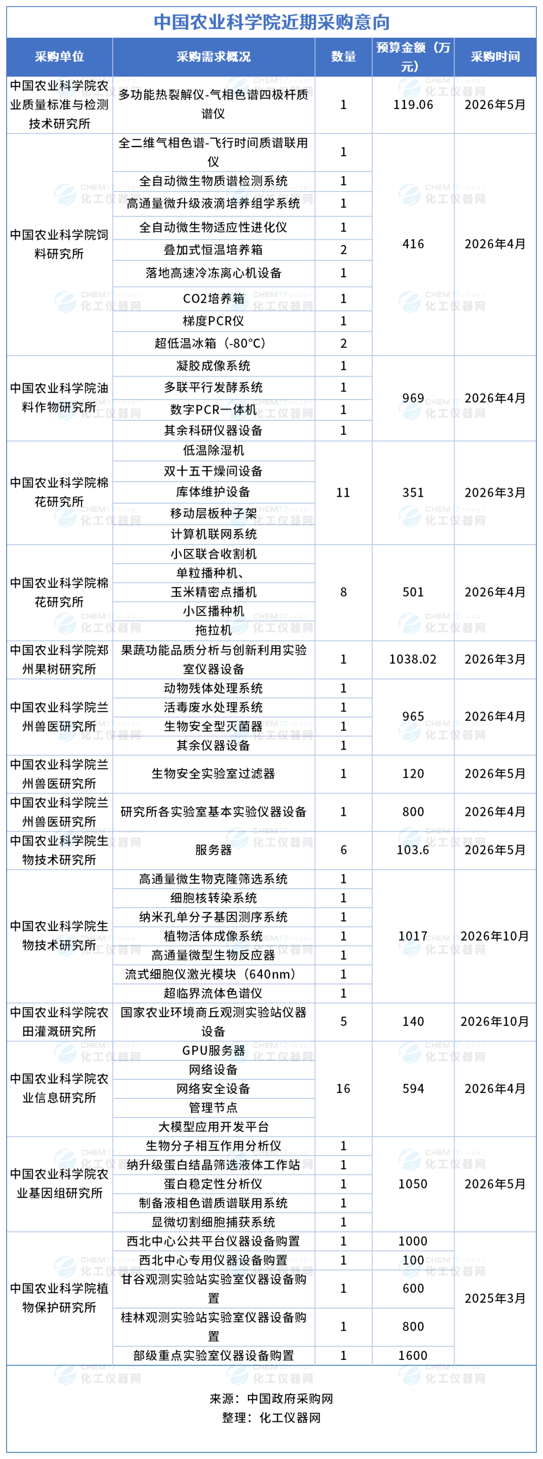 近期,中國農業科學院各院所發布多項儀器采購意向,采購預算金額12283.68萬元,涉及儀器設備包括多功能熱裂解儀-氣相色譜四極桿質譜儀、全二維氣相色譜-飛行時間質譜聯用儀、全自動微生物質譜檢測系統、高通量微升級液滴培養組學系統、全自動微生物適應性進化儀、疊加式恒溫培養箱、落地高速冷凍離心機設備等。預計采購時間2026年3月-10月。