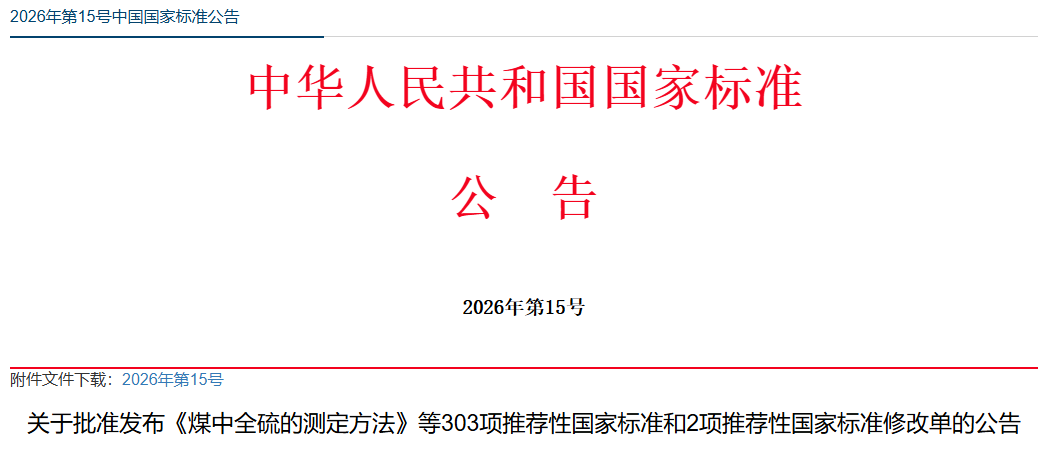 關于批準發(fā)布《煤中全硫的測定方法》等303項推薦性國家標準和2項推薦性國家標準修改單的公告