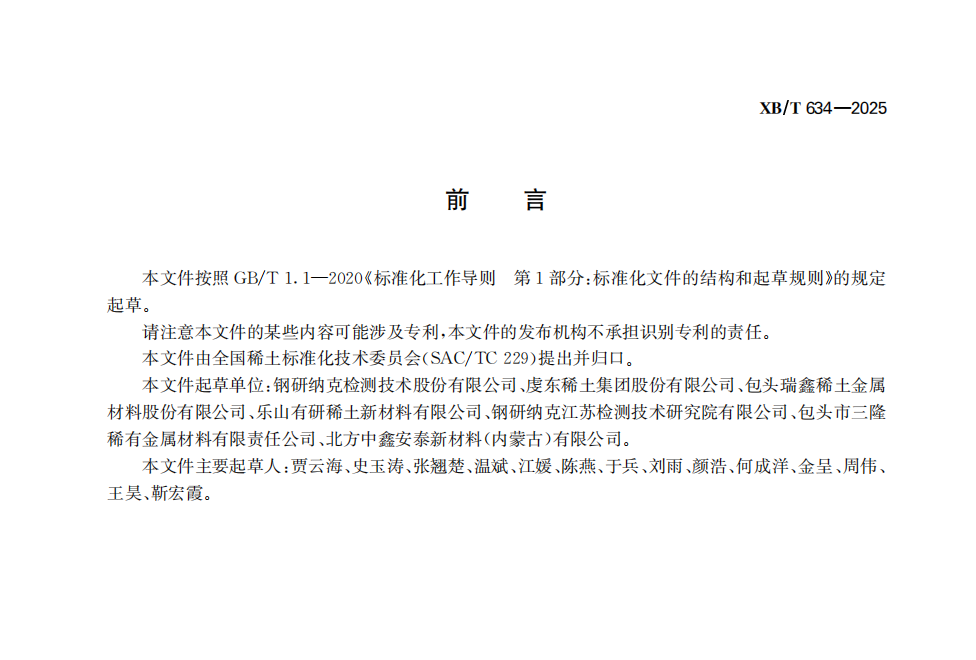 由鋼研納克檢測技術股份有限公司(以下簡稱“鋼研納克”)牽頭,鋼研納克江蘇檢測技術研究院有限公司參與,聯合多家行業重點稀土金屬生產企業共同起草的稀土行業標準《XB/T 634-2025 鐠釹金屬化學分析方法 碳、鐵、鉬、鋁、硅和鐠含量的測定 火花放電原子發射光譜法》已于2025年8月19日發布,于2026年3月1日起正式實施。作為稀土行業首個采用火花光譜分析方法的標準,它進一步完善了鐠釹金屬化學成分檢測方法體系,也體現了鋼研納克及鋼研納克江蘇檢測技術研究院有限公司在稀土檢測技術研發與標準化建設方面的持續積累。