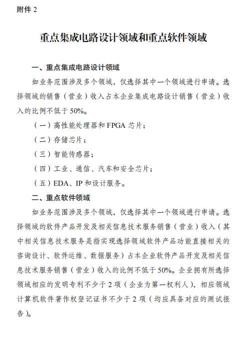 一、本通知所稱清單是指《若干政策》第(一)條提及的國家鼓勵的集成電路線寬小于28納米(含)、線寬小于65納米(含)、線寬小于130納米(含)的集成電路生產企業或項目的清單;《若干政策》第(三)、(六)、(七)、(八)條和《財政部、海關總署、稅務總局關于支持集成電路產業和軟件產業發展進口稅收政策的通知》(財關稅〔2021〕4號)、《財政部、國家發展改革委、工業和信息化部、海關總署、稅務總局關于支持集成電路產業和軟件產業發展進口稅收政策管理辦法的通知》(財關稅〔2021〕5號)提及的國家鼓勵的重點集成電路設計企業和軟件企業,集成電路線寬小于65納米(含)的邏輯電路、存儲器生產企業,線寬小于0.25微米(含)的特色工藝集成電路生產企業,集成電路線寬小于0.5微米(含)的化合物集成電路生產企業和先進封裝測試企業,集成電路產業的關鍵原材料、零配件(靶材、光刻膠、掩模版、封裝載板、拋光墊、拋光液、8英寸及以上硅單晶、8英寸及以上硅片)生產企業,集成電路重大項目和承建企業的清單;《公告》提及的國家鼓勵的集成電路生產企業或項目歸屬企業、國家鼓勵的集成電路設計企業清單。