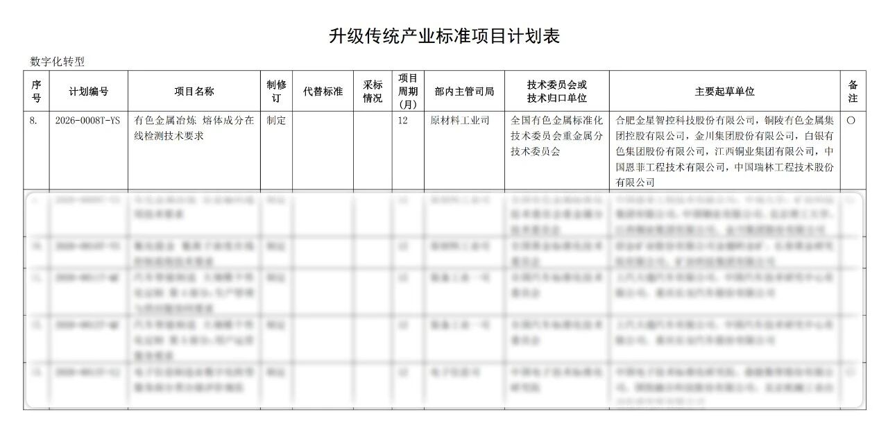 近日,國家工業和信息化部正式發布《2026年第一批行業標準制修訂和外文版項目計劃》,由金星智控牽頭申報的《有色金屬冶煉熔體成分在線檢測技術要求》(計劃編號:2026-0008T-YS)行業標準獲批立項。這標志著我國有色金屬冶煉熔體成分在線檢測領域即將迎來首項行業技術規范,將有力推動行業從取樣離線化驗室檢測邁向在線原位檢測。