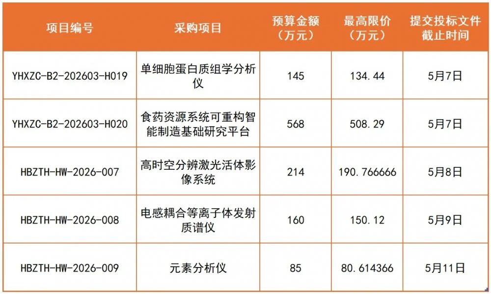 近日,武漢輕工大學生科院大型儀器設備平臺設備更新項目項目已正式啟動公開招標。本次采購涵蓋單細胞蛋白質(zhì)組學分析儀、食藥資源系統(tǒng)可重構(gòu)智能制造基礎(chǔ)研究平臺、高時空分辨激光活體影像系統(tǒng)、電感耦合等離子體發(fā)射質(zhì)譜儀及元素分析儀等多套高端科研設備,整體預算金額達1172萬元,項目最早投標截止時間為5月7日。
