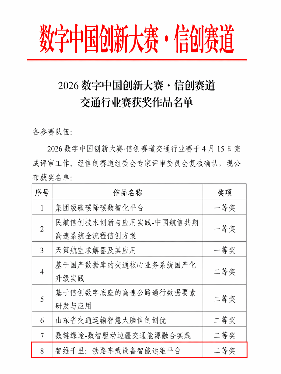在行業創新與成果認定方面,"和行"軌道交通大模型同樣取得顯著突破:其創新應用作品《智維千里:鐵路車載設備智能運維平臺》在"2026年數字中國創新大賽信創賽道"交通行業賽中榮獲二等獎,充分展現了模型在實際場景中的創新價值與應用潛力;同時,該模型成果入選中國軟件行業協會《2025中國軟件產業發展藍皮書》成果征集,并獲評《2025年軟件和信息技術服務業先進性成果》1項;此外,"基于大模型的鐵路信號設備智能運維"創新應用案例成功入選中國鐵道學會《2025人工智能大模型驅動智能鐵路發展藍皮書》,成為智能鐵路大模型技術應用標桿案例,標志著"和行"軌道交通大模型在技術創新、產業應用與行業影響力方面獲得權威認可。